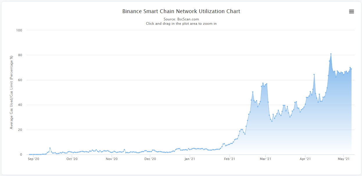 Según datos de BscScan, la utilización de la red de Binance Smart Chain ya ha tocado picos de 80%. Por otro lado, las comisiones de la red se dispararon mientras que el gas requerido para procesar una transacción sigue intentando compensar esta congestión con bajas hacia los 5 gwei.