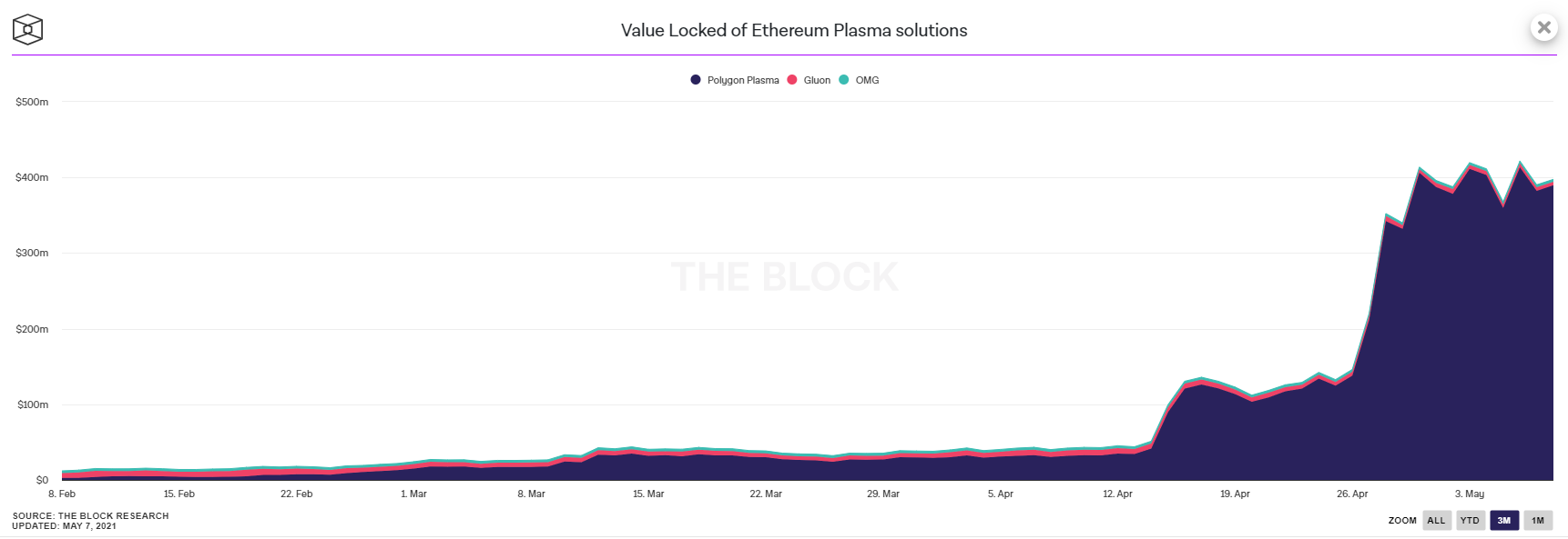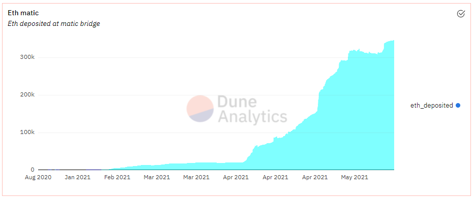 De la misma forma, las cantidades de DAI, USDT y ETH depositados en el puente (bridge, por su traducción al inglés) de Matic Network están subiendo vertiginosamente. Por si fuera poco, para inicios de abril el valor bloqueado en Plasma de Polygon era de $29 millones de dólares, y para el final del mismo mes alcanzó la cifra de $413 millones de dólares, un incremento de 14 veces.