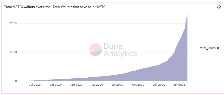 En cuanto al número de usuarios, la red de Polygon demuestra una explosión de nuevas direcciones activas en su red bajo el mismo marco temporal. Dune Analytics marca que las direcciones que han mantenido MATIC en Polygon ya son más de 200.000 y siguen en aumento.