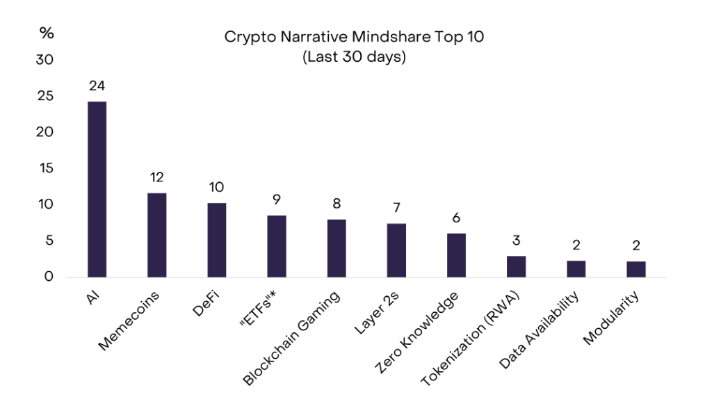 El último informe de Grayscale también destaca que la IA ha surgido como un tema pivote en la industria, particularmente en los sectores de Plataformas de Contratos Inteligentes y Servicios y Utilidades.