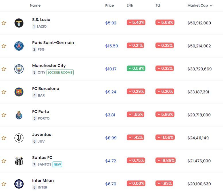 SponsoredDatos del agregador de datos de fan tokens, FanMarketCap, revelan que los fan token más valiosos del mercado son LAZIO ($50 millones), Paris Saint-Germain ($49,9 millones), Manchester City ($38,7 millones), FC Barcelona ($33,4 millones), FC Porto ($29,6 millones), Juventus ($24,41 millones) y Santos FC ($21,4 millones).