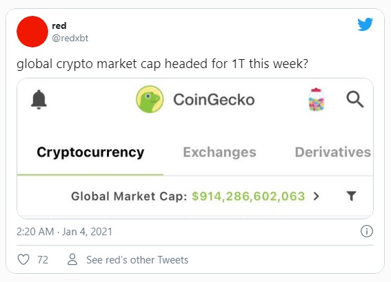 El 3 de enero de 2021, la capitalización de mercado acumulativa de todas las criptomonedas se disparó a la friolera de 913 mil millones de dólares, un nuevo récord histórico.