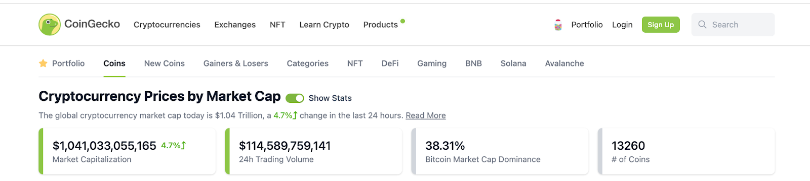 La capitalización total del criptomercado en TradingView calcula el total de solo las 125 monedas principales. Por lo tanto, existe una diferencia en la capitalización de mercado reportada por CoinGecko que considera más de 13,260 monedas.