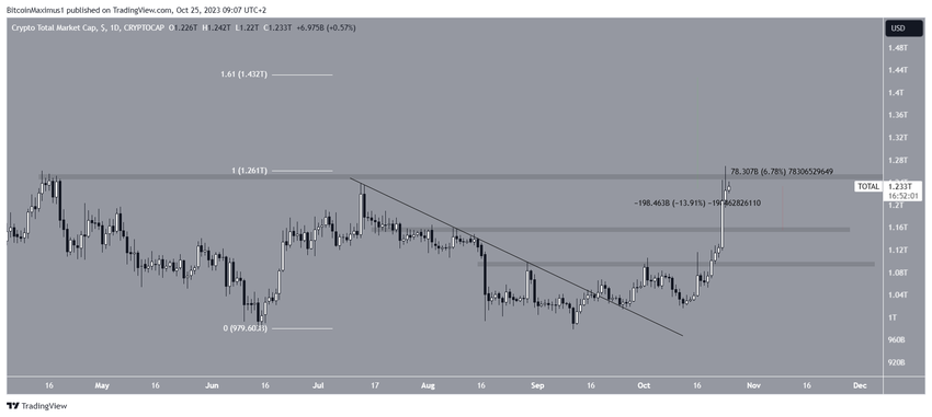Desde entonces, el índice ha aumentado a un ritmo acelerado. Durante el movimiento ascendente, la capitalización del mercado de criptomonedas superó las zonas de resistencia horizontal de 1,10 y 1,16 billones de dólares.