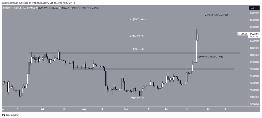 Durante el repunte, el precio de BTC se movió por encima del retroceso externo de Fibonacci de 1,27 de la caída anterior en 33.700 dólares.