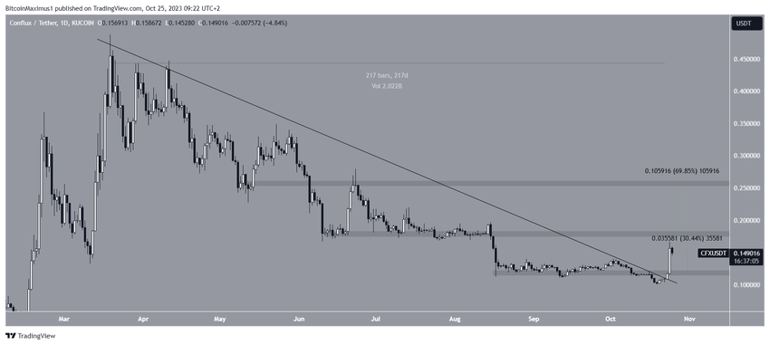 El precio del CFX ha caído por debajo de la línea de tendencia de resistencia descendente desde su máximo local de 0.49 dólares en marzo de 2023. Esto llevó a un mínimo de 0.10 dólares en octubre.