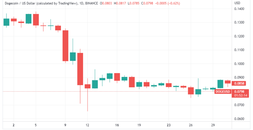 Dogecoin abrió el 1 de mayo a 0.1276 dólares, alcanzó un máximo mensual de 0.1373 dólares el 5 de mayo, probó un mínimo mensual de 0.07004 dólares el 12 de mayo y finalizó el mes a un precio de cotización de 0.08586 dólares.
