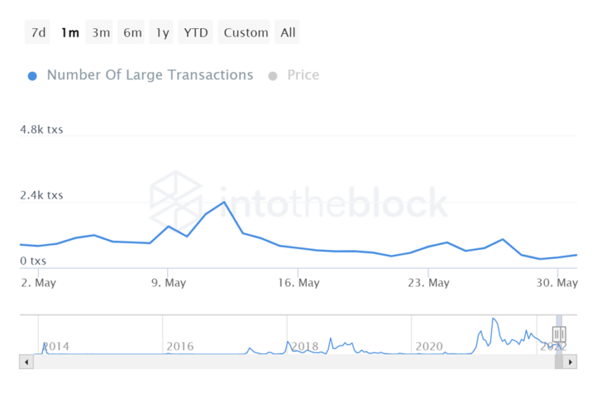 El número de grandes transacciones de Dogecoin alcanzó un máximo de 2,400 a un precio de 0,07 dólares el 12 de mayo.