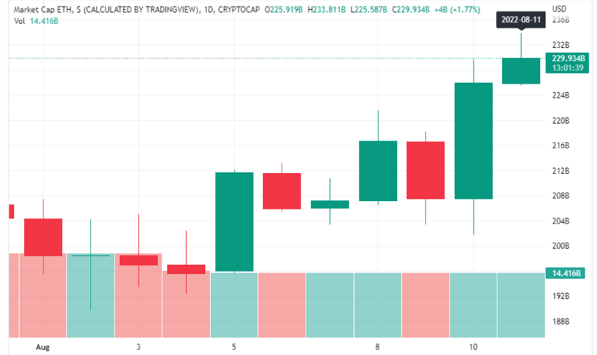 Este fue un aumento del 10% desde la capitalización de mercado de cierre del martes. Ese día, ETH registró un volumen de trading de 16,37 mil millones de dólares, y esto correspondió a una capitalización de mercado en la región de 207,89 mil millones de dólares.