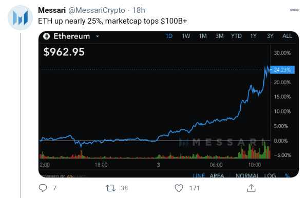 La gran subida de precios también ha llevado la capitalización de mercado de Ethereum a un territorio de doce cifras por tercera vez en la historia.