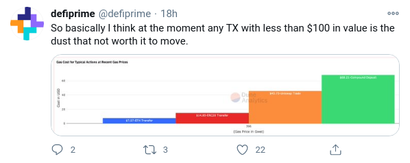 «Ethereum está sufriendo efectos anti red. Cada nuevo usuario hace que el sistema sea menos utilizable para otros usuarios, desplazándolos. Por ejemplo, ahora mismo hacer trade en Uniswap cuesta unos 100 dólares en gas. Enviar algo de ETH cuesta alrededor 10 dólares».