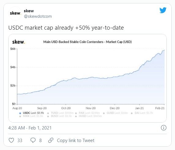 Sin embargo, este crecimiento constante se aceleró a principios de 2021. Este nuevo impulso hizo que la capitalización de mercado del USDC aumentara de más de 3 mil millones de dólares a aproximadamente 6 mil millones de dólares solo en enero.