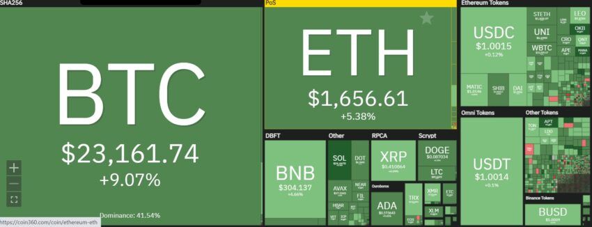 Los datos de CoinMarketCap muestran que la capitalización del mercado cripto recuperó la marca del 1 billón de dólares durante su recuperación de más del 7% en las últimas 24 horas. Bitcoin aumentó un 8.87%, mientras que Ethereum ganó un 5.13%.
