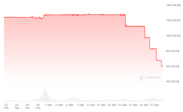 Cuando Binance anunció el listado de los pares de trading de la stablecoin, su capitalización de mercado era de aproximadamente 1,28 mil millones de dólares. Una semana después, se ubica en 615,97 millones de dólares, registrando una caída apoteósica del 50% en siete días.