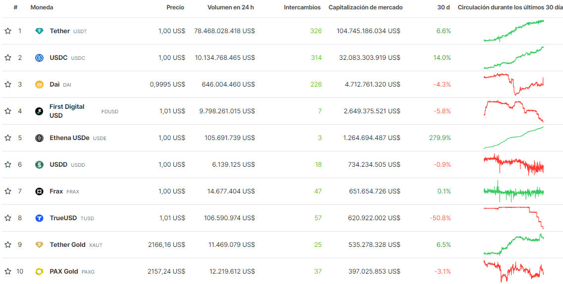 Este segmento del mercado de las criptomonedas es encabezado por el líder indiscutible Tether (USDT), con una capitalización total de 104,74 mil millones de dólares, triplicando así a su más cercano val USD Coin (USDC) de Circle.