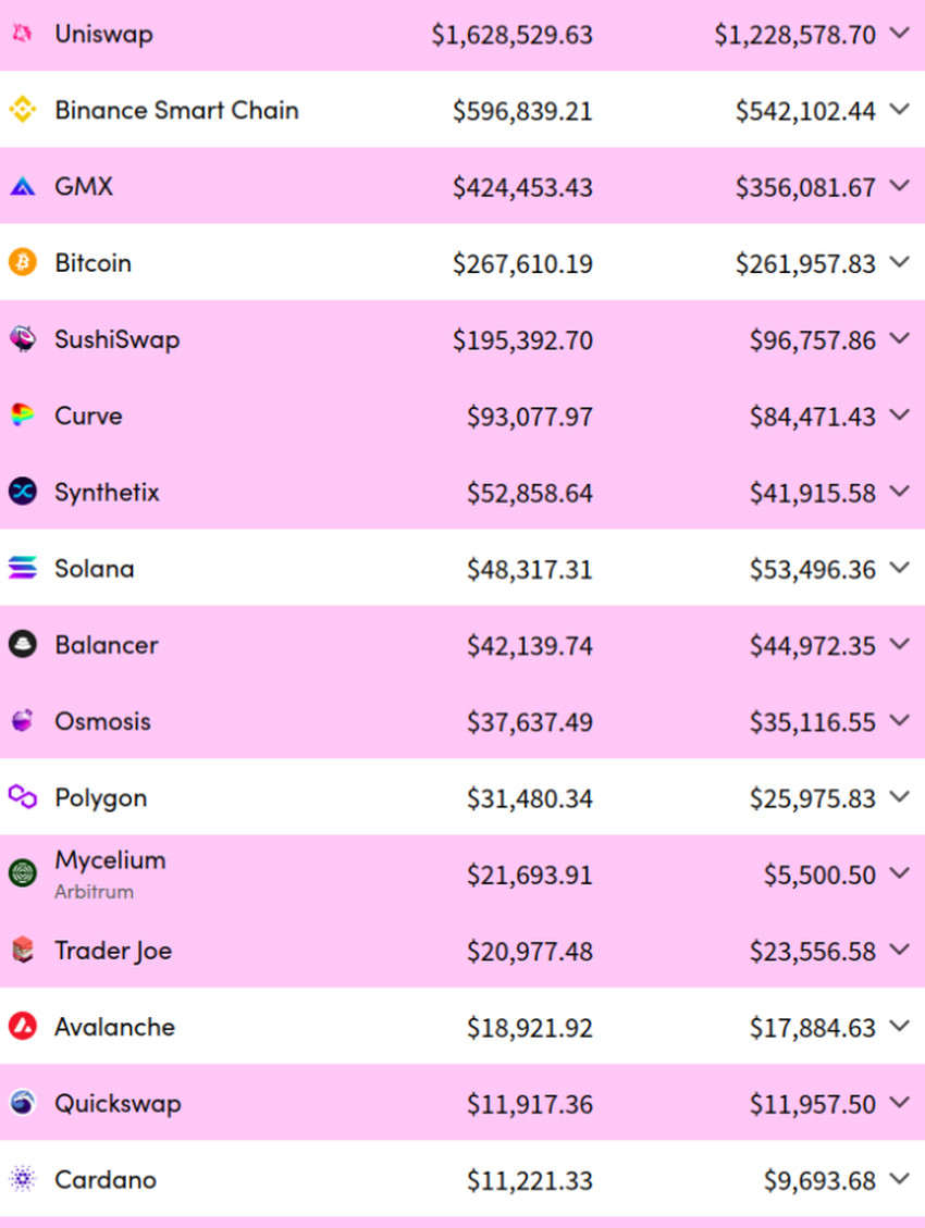 En particular, Uniswap también tiene un recuento de tarifas diarias de 1 millón de de dólares más alto en comparación con los 10,000 dólares o menos de Cardano en tarifas diarias.