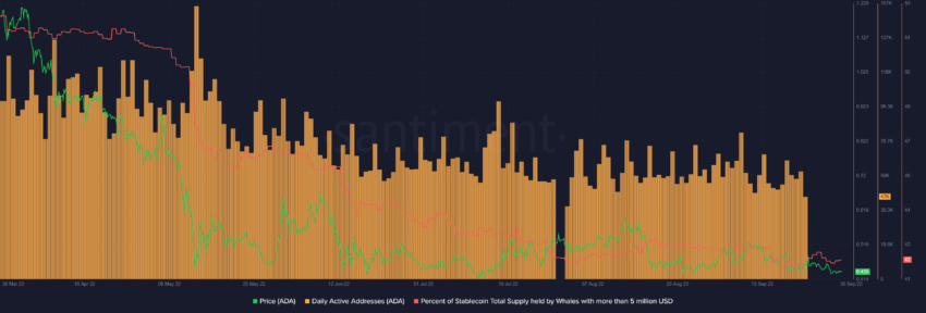Sin embargo, con el porcentaje del suministro total de stablecoins en poder de las ballenas con más de 5 millones de dólares como mínimo, era evidente que las ballenas ADA notaban una menor confianza, notando un declive continuo.