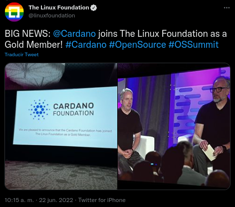 El anuncio realizado el miércoles 22 de junio se dio en el marco del “Open Source Summit” realizado en Austin. Este hito es de gran importancia para Cardano, tanto en términos de publicidad como de aceptación como una fuerza global en materia blockchain.