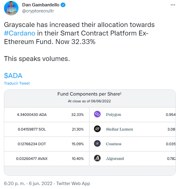 Un ejemplo del interés en Cardano es que Grayscale ha otorgado a ADA la mayor asignación. De esta forma, la asignación de ADA por parte del administrados de activos digitales asciende a un 32.33%, seguido de Solana (SOL) con un 21,30%.