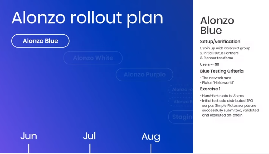 Input Output Hong Kong (IOHK) presentó oficialmente el plan de implementación de Alonzo y a su vez dio inicio a la testnet Alonzo Blue.