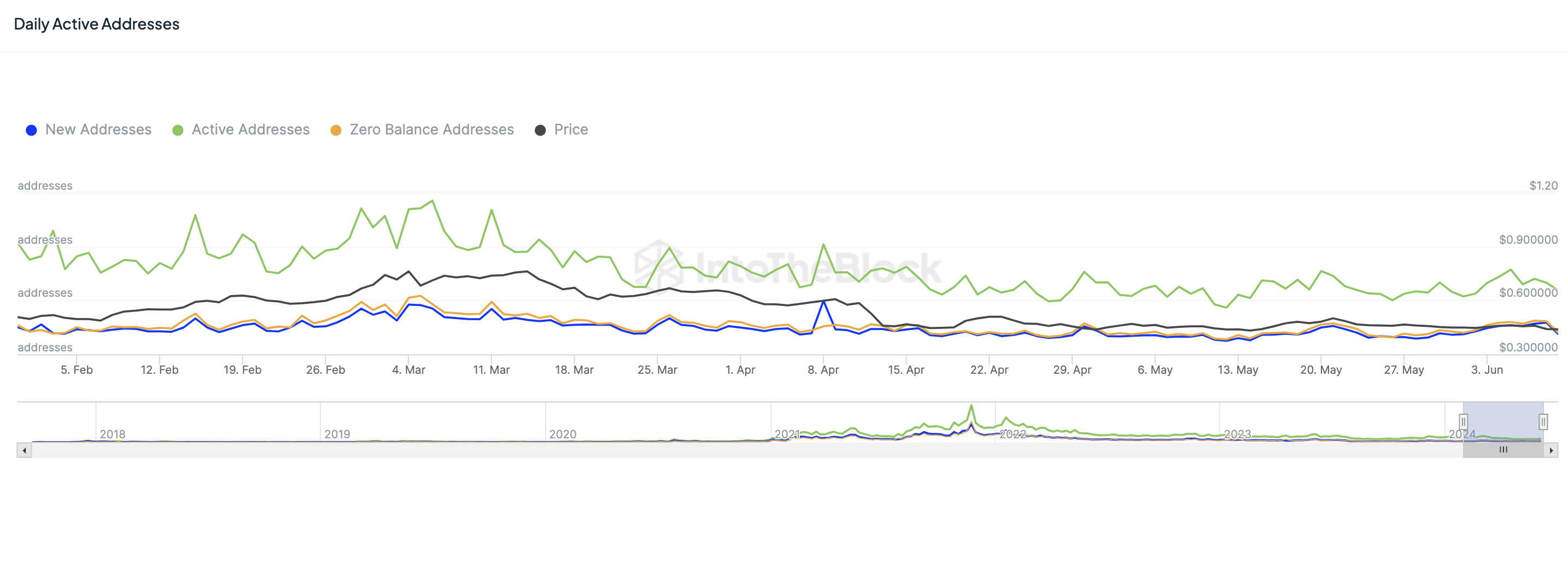 Las nuevas direcciones experimentaron un fuerte descenso el 9 de junio, cayendo en 5,254. Mientras que las direcciones activas alcanzaron su punto máximo el 3 de junio antes de desplomarse en 6,840 el 6 de junio. Las direcciones con saldo cero también mostraron volatilidad, con una caída sustancial de 5,198 el 9 de junio.