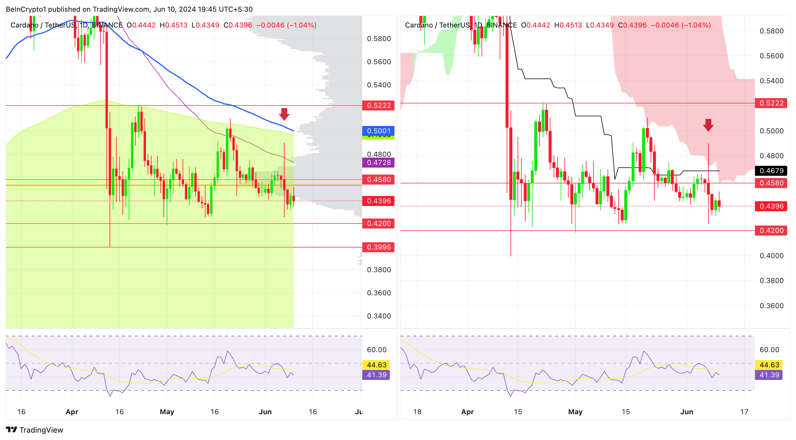 En su intento hacia los 0.48 dólares, Cardano entró en la Nube de Ichimoku y posteriormente fue rechazado, señalando otra perspectiva técnica bajista.