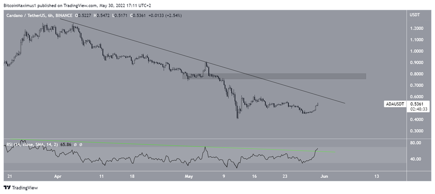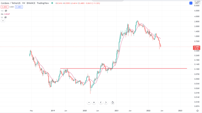 ADA ha estado cayendo desde que alcanzó un precio máximo histórico de 3.10 dólares el 2 de septiembre de 2021. El movimiento a la baja provocó una ruptura de una línea de soporte ascendente que había estado vigente desde marzo de 2020. Condujo a un mínimo de 0.40 dólares el 12 de mayo.