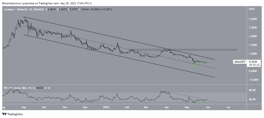Cardano (ADA) ha estado aumentando desde que alcanzó un mínimo el 12 de mayo. Es posible que el aumento eventualmente provoque una ruptura de un canal paralelo descendente a largo plazo.