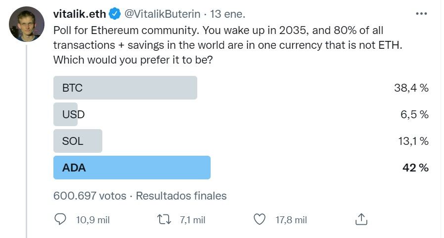 A su vez, en las primeras semanas del año, el fundador de Ethereum, Vitalik Buterin realizó una encuesta en Twitter preguntándole a su audiencia cuál era la moneda que ellos preferían en el caso en el ETH no tuviese éxito en un futuro, a lo que el 42% de los usuarios respondieron “ADA”, esto por encima de Bitcoin (38.4%), Solana (13.1%) y el dólar (6.5%). Demostrando con esto el apoyo que hay dentro de la comunidad cripto hacia Cardano.