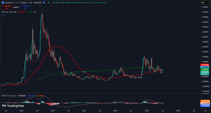 En los últimos días, Cardano (ADA) ha protagonizado un hecho técnico importante: la formación de su primera cruz dorada en el gráfico semanal. Esta es una señal tradicionalmente alcista que ha sido esperada por muchos analistas.