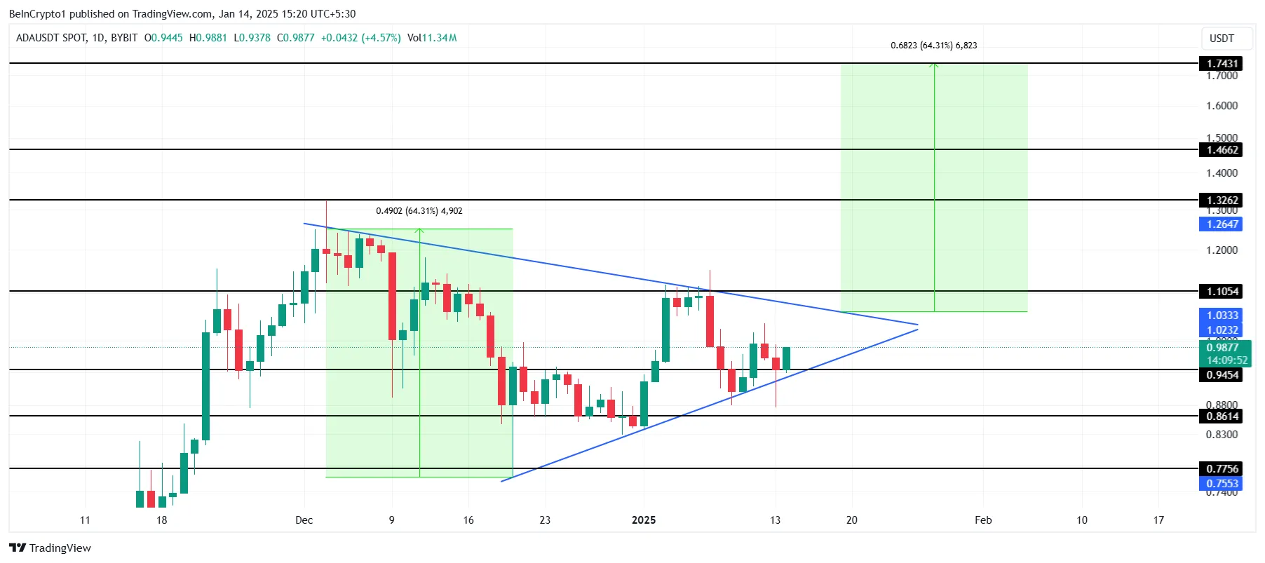 El precio de Cardano se está negociando dentro de un triángulo simétrico, un patrón técnico que sugiere un posible rally del 64% tras la ruptura. Si se realiza, esto empujaría el precio de ADA a un objetivo de 1,74 dólares, representando un aumento significativo para los inversores. La confirmación de la ruptura requeriría que Cardano convierta 1,10 dólares en soporte.