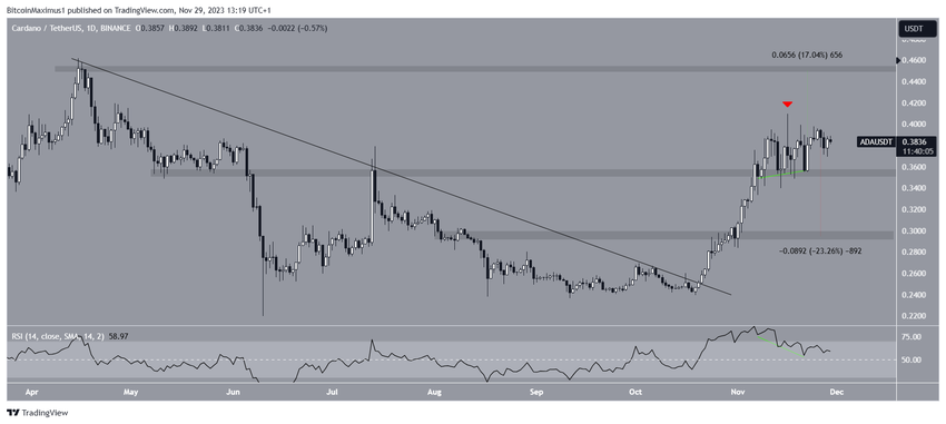 El aumento del precio de ADA culminó con un máximo de 0.41 dólares hace dos semanas, pero no rompió un rango a largo plazo, que ha estado vigente durante más de un año. Más bien, creó una larga mecha superior (icono rojo) y cayó ligeramente.