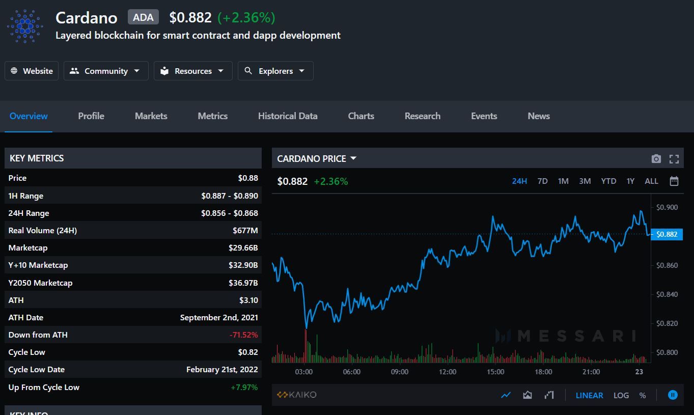 Según datos de la firma de análisis Messari, Cardano tiene un volumen de transacciones de $12,5 mil millones en las últimas 24 horas. El monto es muy superior al observado en otras redes en el mismo período, como Ethereum y Litecoin, que tenían $4,700 millones y $7,200 millones, respectivamente.