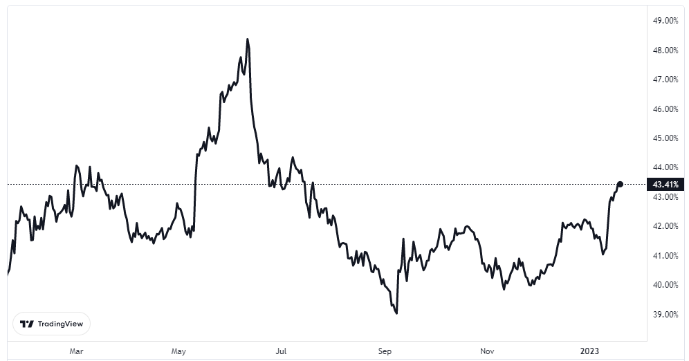 La tasa de dominio de Bitcoin no superaba la marca del 43% desde el pasado mes de julio de 2022, cuando sufrió una dramática caída tras el colapso del ecosistema Terra (LUNA).
