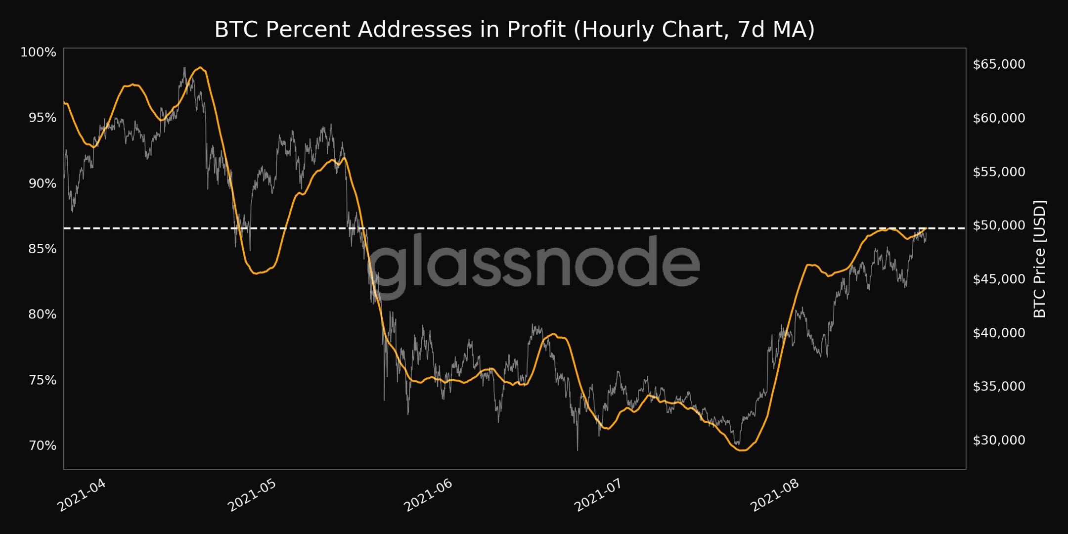 A partir de los datos se infiere que, después de que la criptomoneda más grande por capitalización de mercado superara la marca de los 50 mil dólares, la mayoría de las direcciones de la red entraron en la zona de ganancias después de alcanzar un mínimo del 70% en junio.