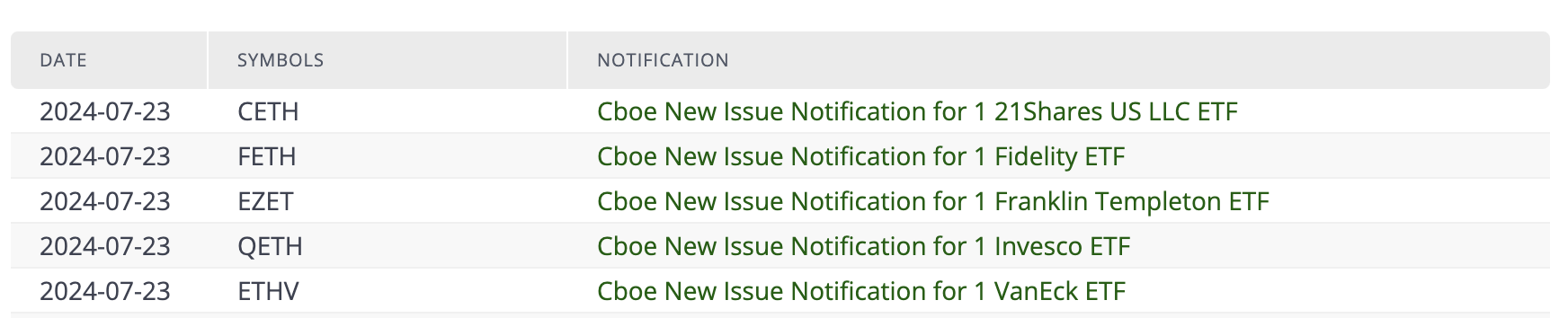 SponsoredLa CBOE dará luz verde a los ETF spot de Ethereum de 21Shares US LLC ETF (CETH), Fidelity ETF (FETH), Franklin Templeton ETF (EZET), Invesco ETF (QETH) y VanEck ETF (ETHV). El cofundador del ETF Institute, Nate Geraci y el trader Michaël van de Poppe, confirmaron el trading de cinco ETF.