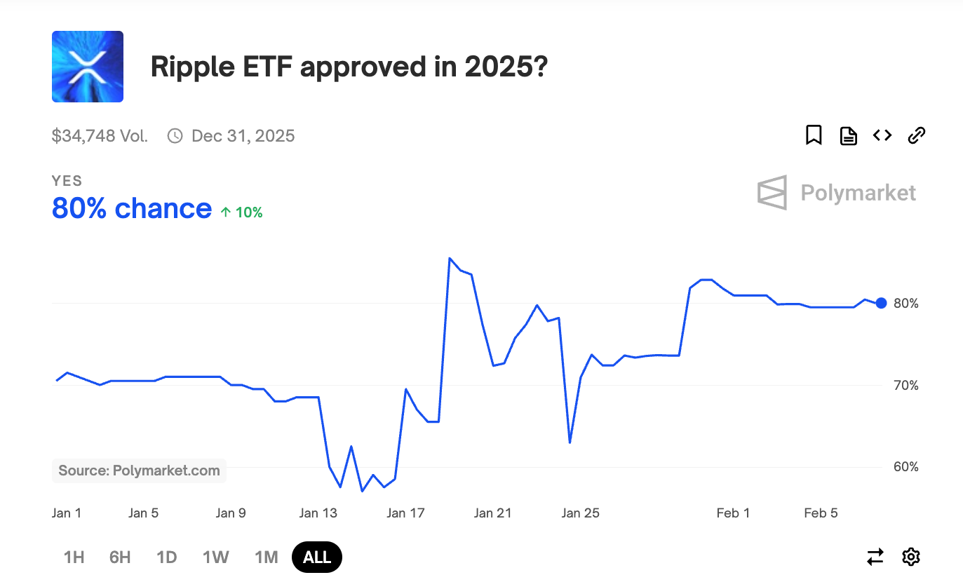 En la plataforma de predicción Polymarket, la probabilidad de que un ETF de XRP reciba aprobación en 2025 ha sido sorprendentemente alta. Las probabilidades eran de un notable 80% en el momento de este informe.