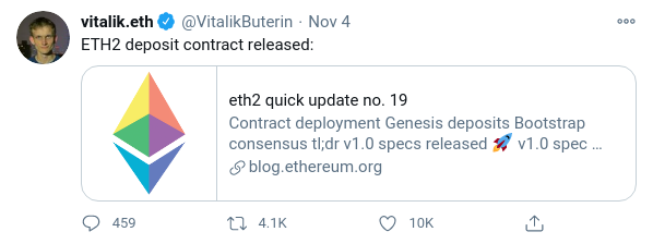 El 4 de noviembre, Vitalik Buterin anunció el contrato de depósito inteligente para Ethereum 2.0. Los holders de ETH podían poner sus tokens en el contrato para hacer staking en el futuro. El contrato necesitaba un soporte de 524.288 ETH (266 millones de dólares) depositados para justificar el lanzamiento. El 24 de noviembre se alcanzó este umbral y, por lo tanto, se puede lanzar Beacon Chain.