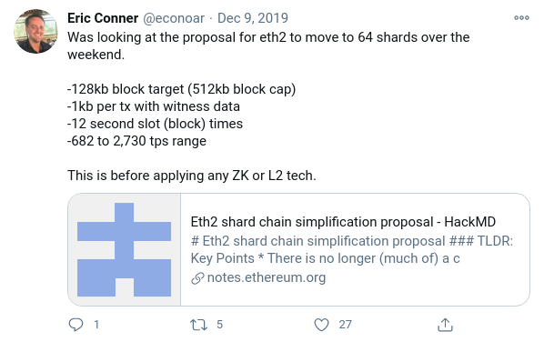Además, Ethereum sigue siendo un proyecto descentralizado. Estas mejoras de escala se realizaron públicamente por la comunidad, como se ejemplifica en este tweet, en el que se discute abiertamente los cambios en el protocolo:
