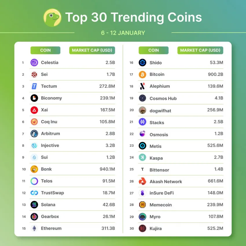 La rápida apreciación de TIA no ha pasado desapercibida. Su explosivo crecimiento le ha asegurado el primer puesto en la lista de criptomonedas de tendencia en CoinGecko. En consecuencia, eclipsando a contendientes como SEI y TET.