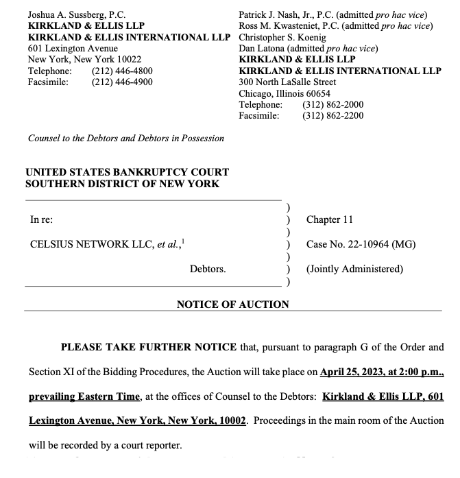 Según una presentación judicial realizada por el bufete de abogados Kirkland & Ellis de Celsius Network, la subasta se realizará en directo el próximo 25 de abril a las 14.00 horas en las oficinas del prestamista de criptomonedas en Manhattan.