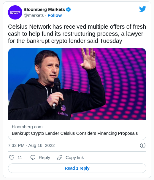 Celsius Network ha recibido ofertas de efectivo para ayudarlo a financiar un posible proceso de reestructuración, dijo un abogado de la compañía.