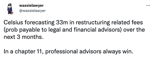 SponsoredCelsius prevé 33 millones de dólares en honorarios relacionados con la reestructuración (probablemente pagos para los asesores jurídicos y financieros) en los próximos 3 meses.