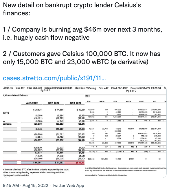 Shubber destacó cómo en los próximos Celsius se iba a enfrentar a unos gastos extraordinarios que afectaría a la empresa muy negativamente, especialmente a su liquidez. Según los datos, Shubber apunta a que Celsius gastará 46 millones de dólares por mes en el siguiente trimestre. Adicionalmente, resaltó el mal estado de las cuentas de Celsius comentando: