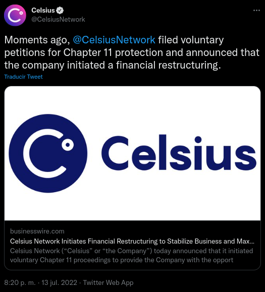 Celsius Network se ha declarado oficialmente en bancarrota bajo el Capítulo 11, anunció la compañía el 13 de julio. El desarrollo ha tardado mucho en llegar, tras varias luchas para mantener a la compañía en funcionamiento en medio de la caída del mercado a principios de este año.