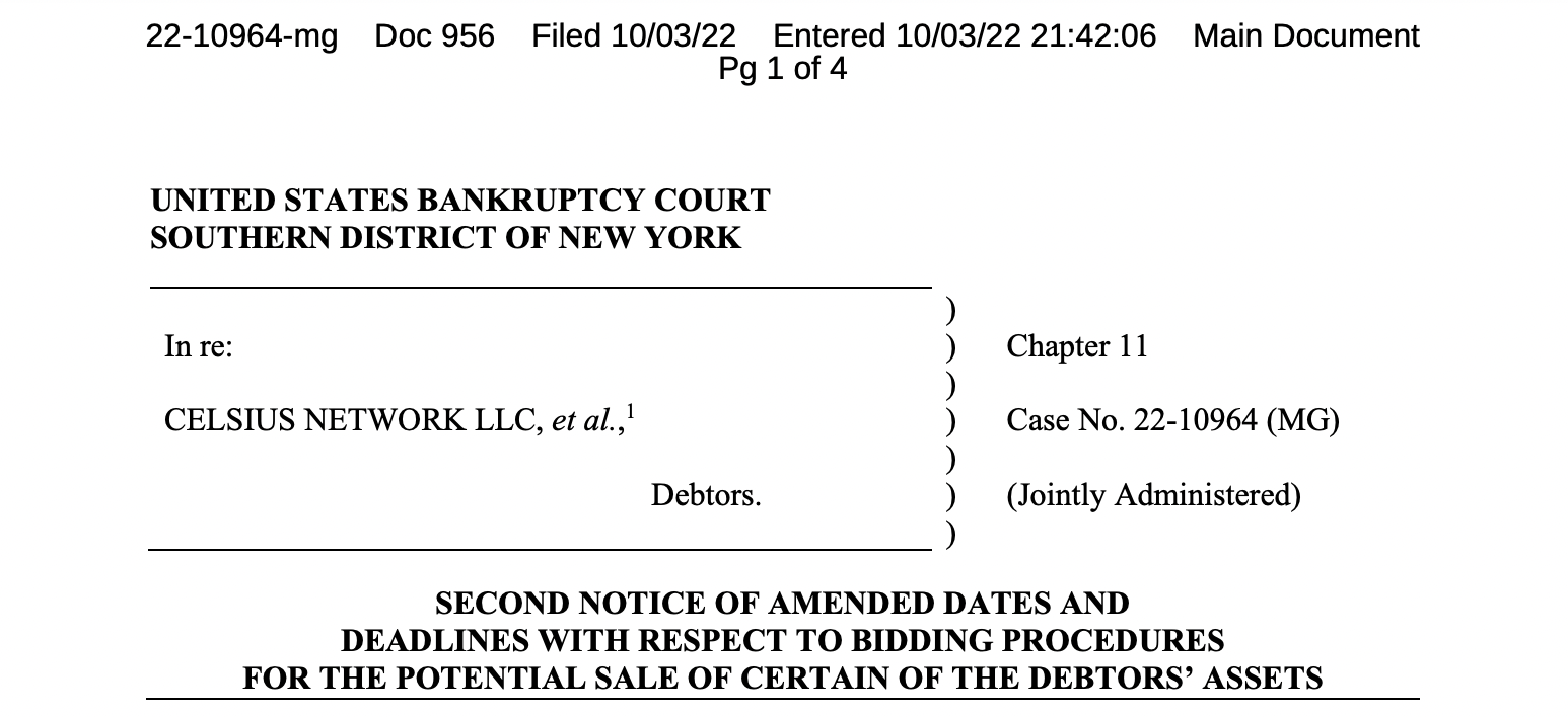 La empresa de préstamo de criptomonedas en quiebra Celsius Network fijó fechas para la subasta de activos, según un documento presentado ante el Tribunal de Bancarrotas de Estados Unidos para el Distrito Sur de Nueva York el 3 de octubre. La subasta se llevará a cabo el 20 de octubre a las 10 a.m.