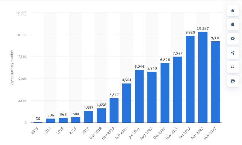 Los datos de Statista muestran que en el primer trimestre de 2022, la cantidad de criptomonedas que cotizan en el mercado (9,929) aumentó alrededor de 250% en comparación con fines de 2019 (2,817). Sin embargo, el número volvió a caer a 9,310 en noviembre de 2022.