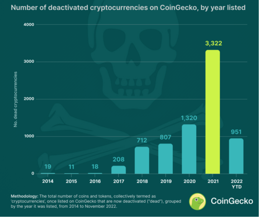 Aparte de 2021, en promedio, alrededor de 900 se incluyeron en la categoría de muertos entre 2018 y 2022. El estudio incluso compartió algunas ideas sobre las causas probables de esto. En particular, la ‘temporada de criptomonedas meme’ que tomó por asalto a la industria fue una causa probable de la alta gama de monedas y fichas inútiles que fallaron en 2022.