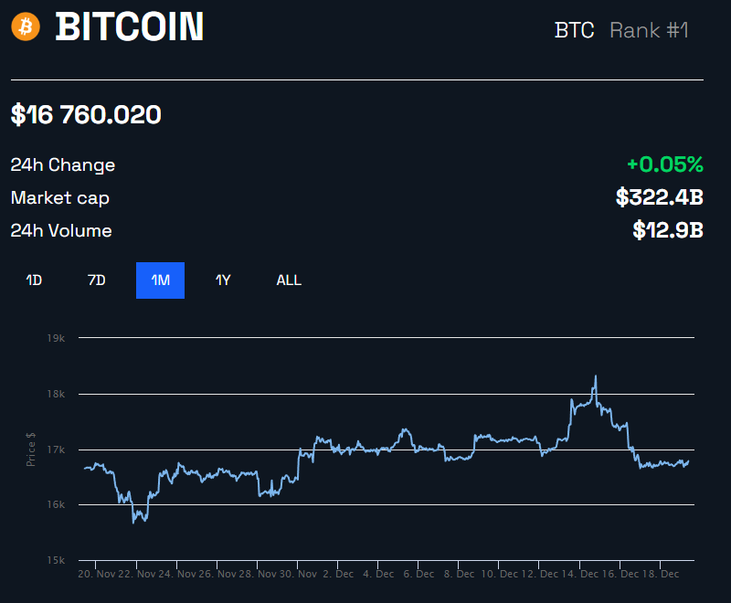 Bitcoin, en la actualidad, cotiza apenas por debajo de la marca de 17,000 dólares y tiene una capitalización de mercado de 322 mil millones de dólares.