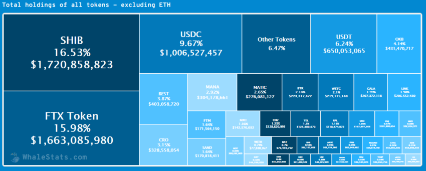 Según información de WhaleStats, un perfil que monitorea el movimiento de las 1,000 direcciones principales en la red Ethereum (ETH), las 100 ballenas SHIB principales juntas tienen más del 25% del suministro circulante total del token. Esto equivale a aproximadamente 137 billones de SHIB, unos 4,100 millones de dólares al tipo de cambio actual.